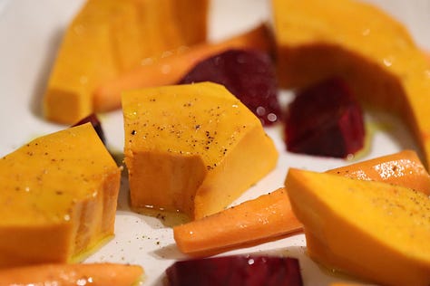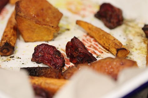 I created this meal last week when I received a Ceres fruit and veg delivery. I’d ordered a whole heap of vegetables for the week, mainly ingredients that my partner and I enjoy cooking with. I was drawn to the root vegetables for their beautiful flavour when roasted and their lovely colours when enjoyed together - the oranges of the pumpkin and carrots with the beetroot is a visual delight! This is a quick and easy weeknight meal that tastes like something that should require far more effort and time!