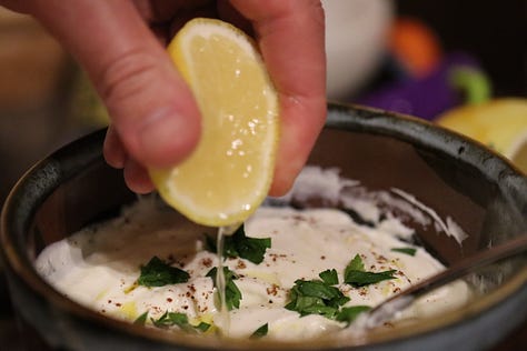 In a separate bowl add the yoghurt, lemon rind, lemon juice (to taste), olive oil, salt, pepper and sumac.
