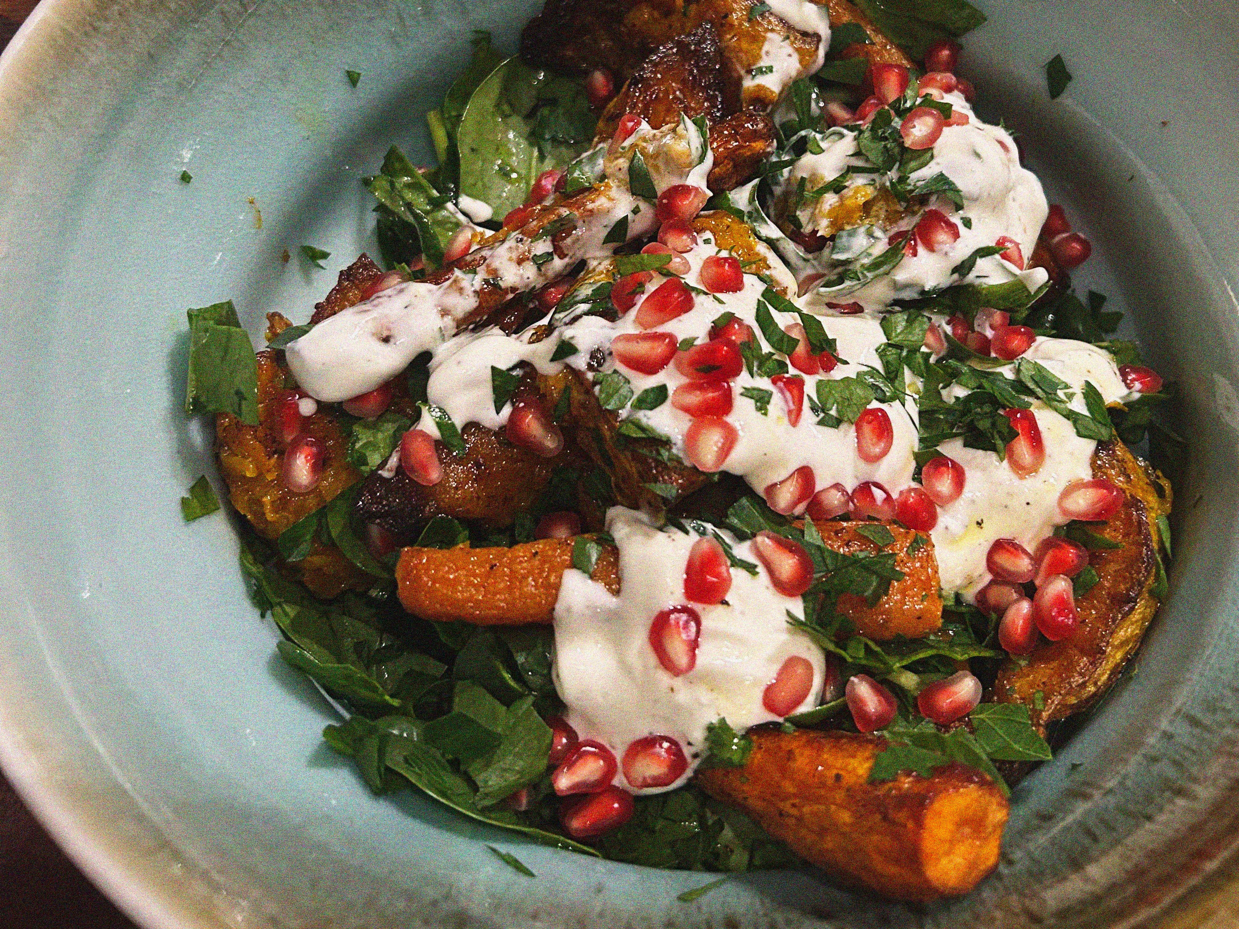 Add the roast vegetables to the spinach and add half of the yoghurt dressing. Lightly toss the salad to combine. Add the remaining yoghurt and parsley atop the salad.